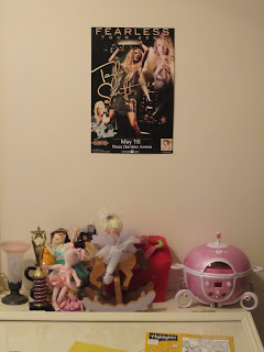 Well...maybe a little bit of the little girl is there. Sebastian needed to stay on the door. There are still stuffed animals and seashells and other little treasures everywhere, but her first posters have appeared. She's growing up.